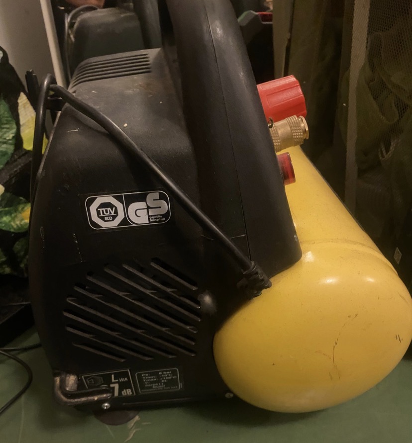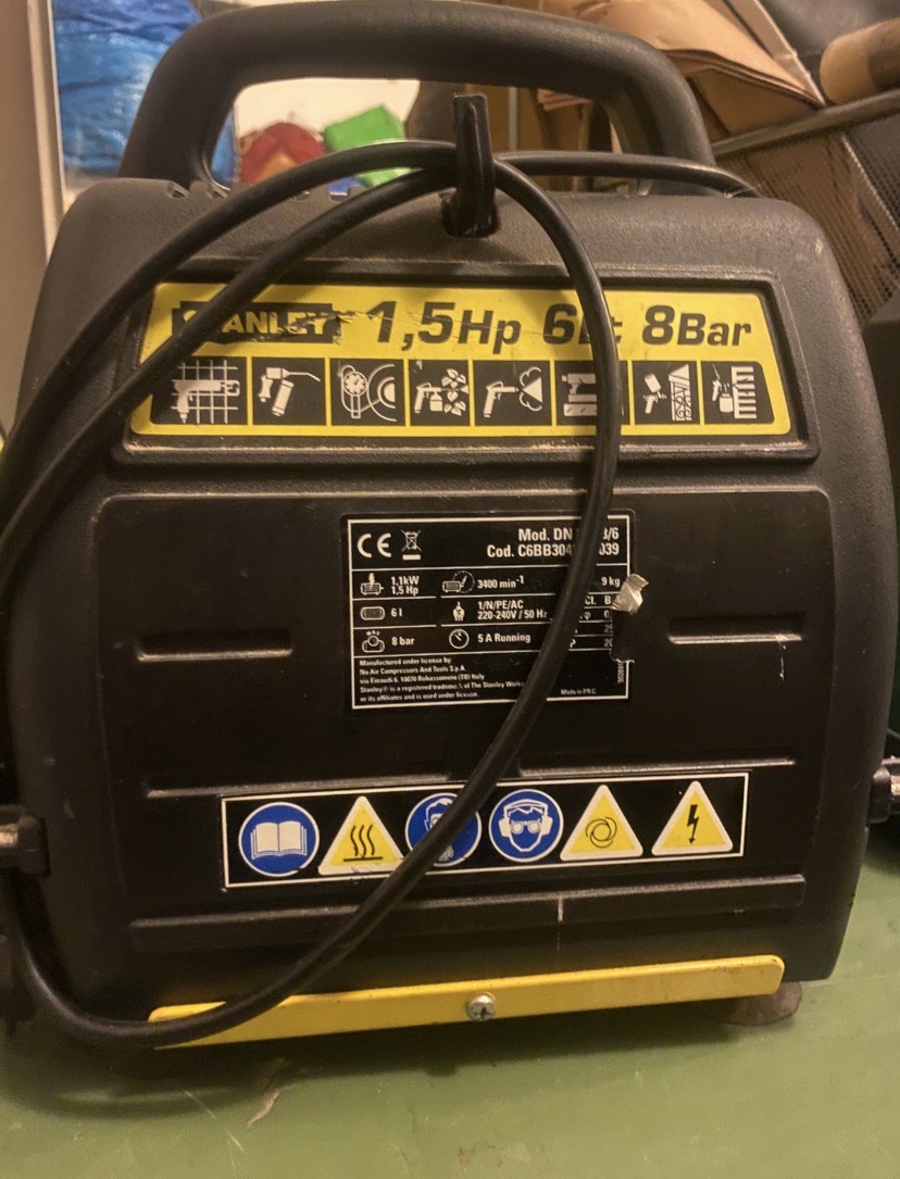 Oljefri kompressor från Stanley, ämnad för hemmabruk. Liten modell som är lätt att bära med sig. Med krok och upphängning på baksidan för redskap och kabel.